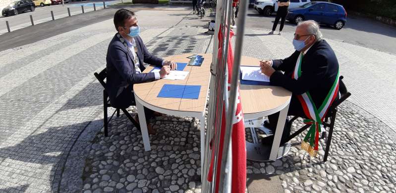 (ANSA) – GORIZIA, 22 MAG – Un’unica scrivania, tagliata a metà da una rete a causa della chiusura dei confini: è l’immagine simbolo dell’azione dimostrativa del sindaco di Gorizia, Rodolfo Ziberna, e del primo cittadino di Nova Gorica (Slovenia), Klemen Miklavic, che si sono seduti allo stesso tavolo in piazza Transalpina – area per metà italiana e per metà slovena, che negli ultimi mesi è stata divisa da una rete a causa del diffondersi del coronavirus – per parlare di Europa. “Mentre a Bruxelles i vertici dei paesi europei litigano su ogni cosa, ergono confini e, sulla gestione del virus ognuno va per conto suo, i sindaci di Gorizia e Nova Gorica – affermano – continuano a lavorare insieme per costruire l’Europa vera, quella dei cittadini e delle famiglie”.”Sia io sia il collega Miklavic – precisa Ziberna – abbiamo condiviso pensieri, informazioni e azioni, cercando anche di far dialogare i governi, per concertare le scelte sulla chiusura del confine. Purtroppo non c’è ascolto ma noi andiamo avanti”.