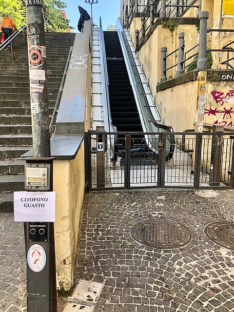 ” In particolare – puntualizza Capodanno – al momento è ancora chiusa, così come peraltro era stato già segnalato prima dell’emergenza Covid-19, la rampa di collegamento presente in via Cimarosa, nei pressi della stazione superiore della funicolare Centrale, benché il motivo di tale fermo e la sua presumibile durata risultano del tutto ignoti, dal momento che sulla grata posta all’ingresso, chiusa con catenaccio, non vi è apposto alcun avviso. Peraltro, anche l’impianto citofonico, posto su una colonnina nei pressi della rampa, è guasto “.