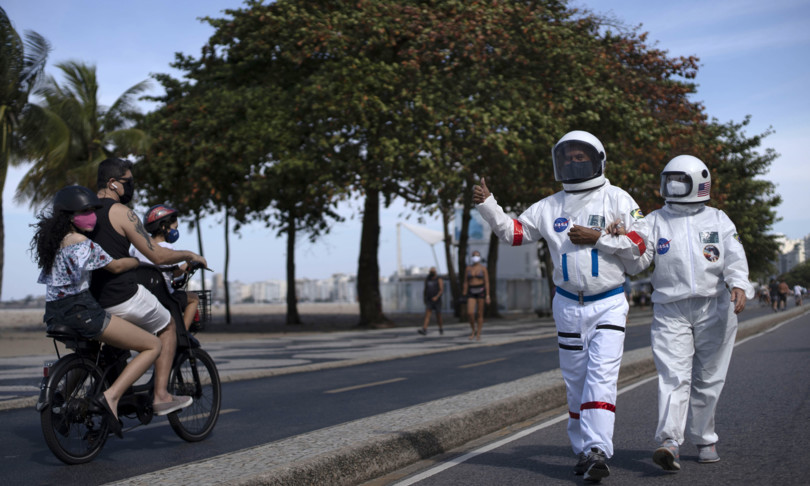Le immagini della coppia che indossa la tuta spaziale dai colori bianco, rosso e blu, in giro per le strade della città carioca, con tanto di stemna dela Nasa, stanno facendo il giro del mondo.