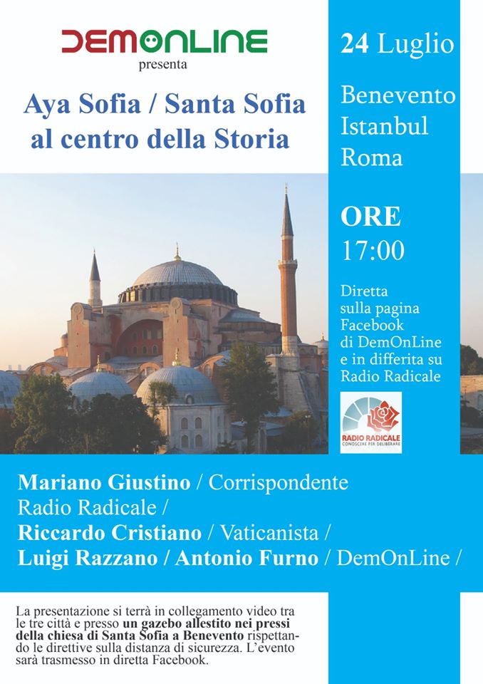DemOnLine organizza venerdì 24 luglio, dalle ore 17:00 alle ore 18:00, un incontro dal titolo “Aya Sofia / Santa Sofia al centro della Storia° in occasione della riapertura al culto dell’ex museo di Istanbul ove era l’antica Chiesa di Santa Sofia in Costantinopoli.