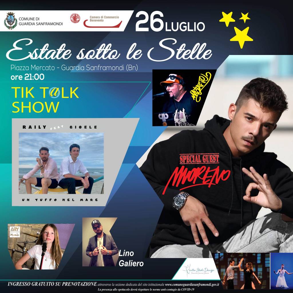 Il noto rapper italiano Moreno ha scelto Guardia Sanframondi, in provincia di Benevento, come prima tappa del suo nuovo tour, dove si esibirà nell’ambito della manifestazione “Estate sotto le stelle”, promossa ed organizzata dall’Amministrazione comunale di Guardia Sanframondi e dalla Camera di Commercio di Benevento, domenica prossima 26 luglio, a partire dalle ore 21:00, in Piazza Mercato.