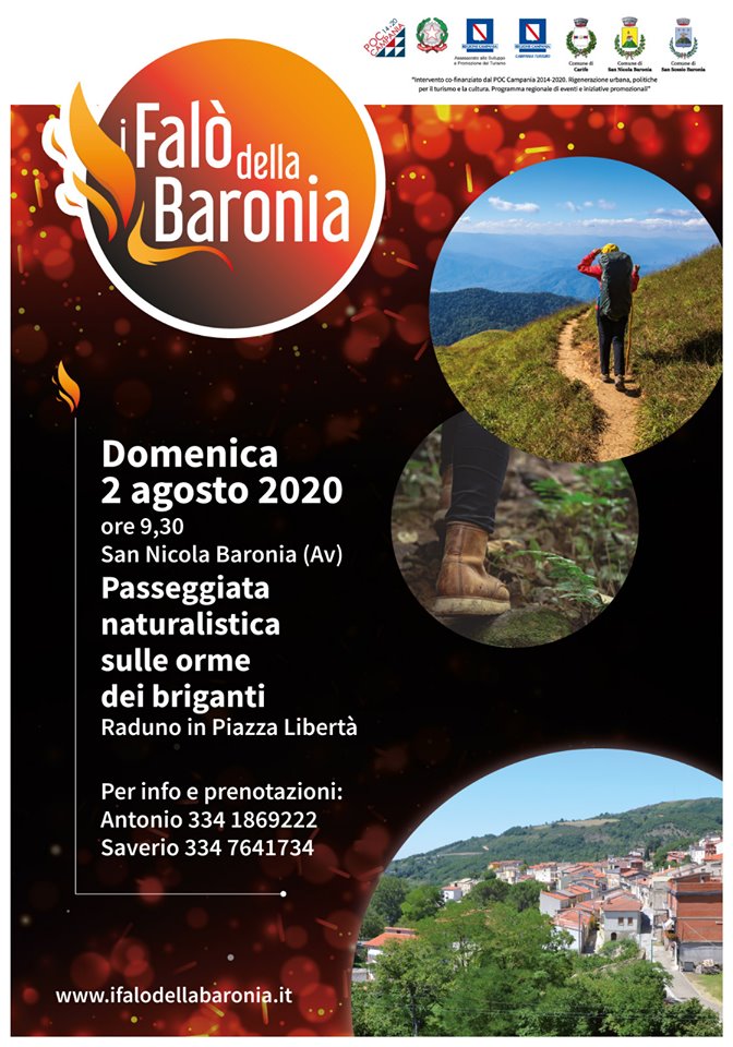 Tornano, dopo l’interruzione causata dal diffondersi del COVID-19, gli appuntamenti de “I falò della Baronia”, progetto promosso dal Comune di Carife, in partenariato con i comuni di San Nicola Baronia e San Sossio Baronia ed è co-finanziato dal POC Campania 2014-2020. “Rigenerazione urbana, politiche per il turismo e la cultura. Programma regionale di eventi e iniziative promozionali”. Nell’attesa che riprendano gli appuntamenti dedicati alla secolare tradizione dei falò in provincia di Avellino, sarà il Comune di San Nicola Baronia, ad ospitare, domenica 2 agosto, una nuova iniziativa collaterale, nell’ambito del programma progettuale. Si tratta di una “Passeggiata naturalistica sulle orme dei briganti” durante la quale si avrà l’occasione di scoprire i segreti di San Nicola in Salices e delle sue erbe officinali. L’inizio è previsto per le ore 9,30 con raduno in Piazza Libertà e arrivo presso l’area pic-nic “Bocche di Carife”. La lunghezza del percorso è di circa 7/8 km, la difficoltà media. Una nuova occasione, dunque, per ricoprire la bellezza del contatto diretto con la natura nel meraviglioso contesto di una delle aree più incontaminate della verde Irpinia, in totale sicurezza. La partecipazione è gratuita ed è gradita la prenotazione. La giornata proseguirà con un intrattenimento musicale presso l’Anfiteatro delle Arti di San Nicola Baronia.