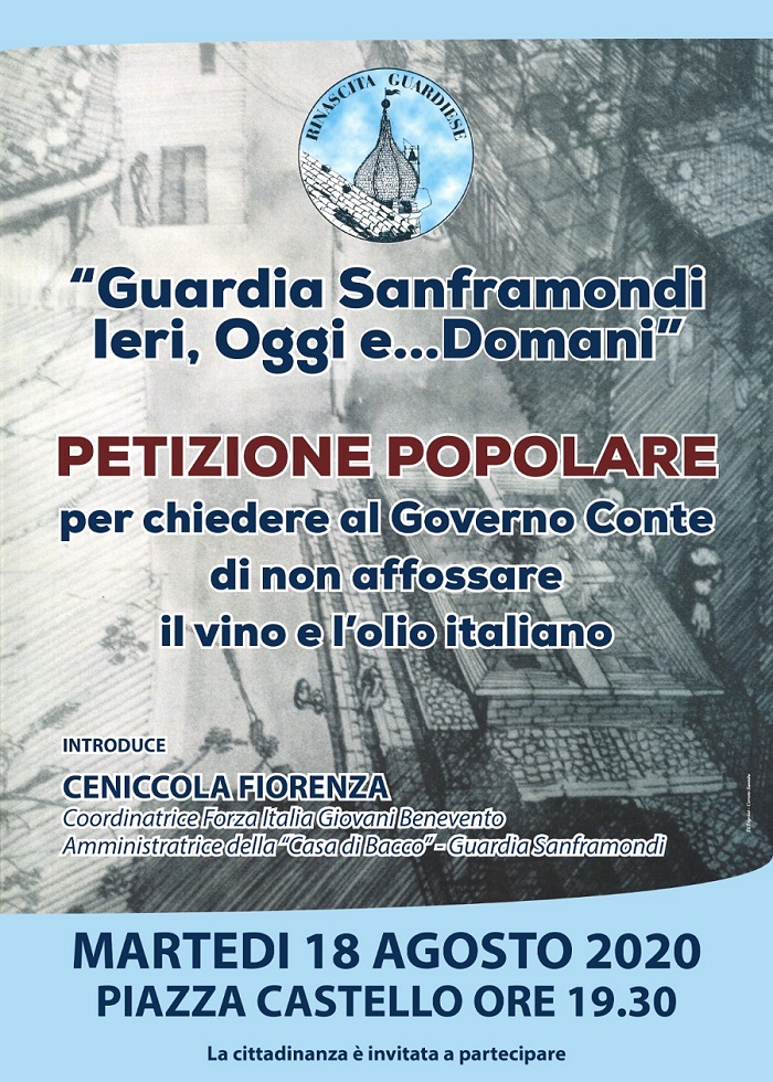 Assieme all’associazione Rinascita Guardiese per difendere gli interessi dei zappatori-vignaioli e lancia una petizione popolare per chiedere al Governo di non ammazzare l’olio e il buon vino italiano