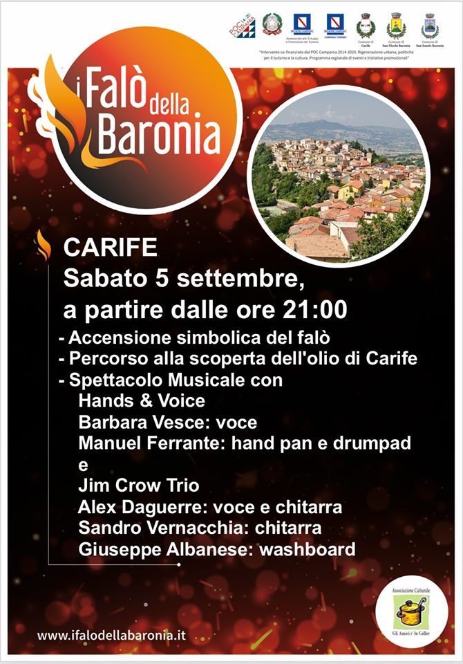 Il progetto “I falò della Baronia”, promosso dal Comune di Carife (AV), in partenariato con i comuni di San Nicola Baronia e San Sossio Baronia e co-finanziato dal POC Campania 2014-2020. “Rigenerazione urbana, politiche per il turismo e la cultura. Programma regionale di eventi e iniziative promozionali”, si chiuderà, con il suo ultimo appuntamento, sabato 5 settembre, proprio presso il Comune di Carife, capofila dell’iniziativa, in Piazza San Giovanni. L’evento riprenderà simbolicamente la tradizione del Falò di San Giuseppe, il cui svolgimento, previsto come da consuetudine per il 19 marzo, è stato impedito a causa dell’emergenza sanitaria nazionale da COVID-19. Si comincia alle ore 21,00, con l’accensione simbolica del falò e il doppio spettacolo musicale con gli “Hands & Voice” Barbara Vesce alla voce e Manuel Ferrante all’hand pan e drumpad e il “Jim Crow Trio”, con Alex Daguerre alla voce e chitarra, Sandro Vernacchia alla chitarra e Giuseppe Albanese al washboard. Durante la serata si terrà anche uno speciale percorso alla scoperta dell’olio di Carife, prodotto tipico principe del territorio. Si conclude così il progetto decorato al rito tutto irpino del falò, dopo al centro della scena vi è il fuoco che con la sua luce vince le tenebre ed è elemento intorno al quale l’intera comunità ritrova la sua unità. Il fuoco è un’occasione per stare insieme in un momento di festa, un modo per rivivere ogni volta il proprio senso di identità e di appartenenza al territorio. Un ultimo appuntamento da non perdere, dunque, per vivere a pieno l’estate in provincia di Avellino.