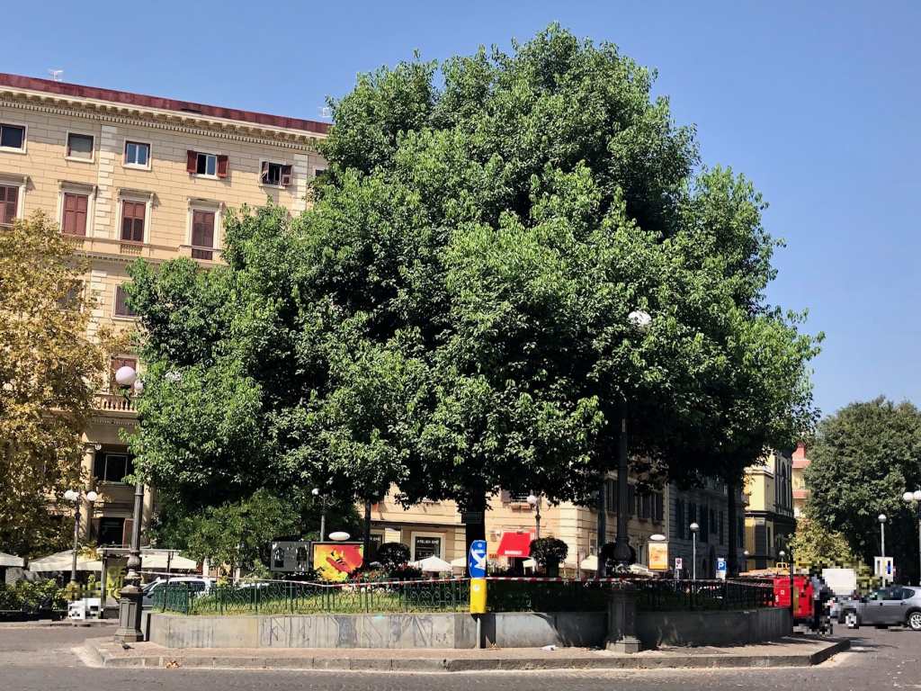 ” Difatti, dopo poco più di dieci anni, oggi gli effetti sono quelli che si vedono nella foto – sottolinea Capodanno -. La pianta ha debordato rispetto ai limiti della recinzione dell’aiuola. Inoltre crescendo in altezza ha anche parzialmente oscurato la telecamera di video sorveglianza posta al centro di piazza Vanvitelli. Infine l’effetto del vento ha contributo a far inclinare sia il tronco che la chioma “.