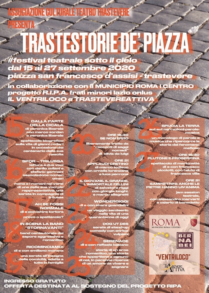 L’ Associazione Culturale Teatro Trastevere è lieta di presentare, nella limitrofa Piazza San Francesco D’Assisi, situata nel famoso Rione di Trastevere, due settimane di spettacolo dal vivo gratuite in favore di alcuni progetti di solidarietà e animazione culturale destinati al quartiere e alle realtà associative che ne fanno parte. Partner di questa iniziativa artistica sono: