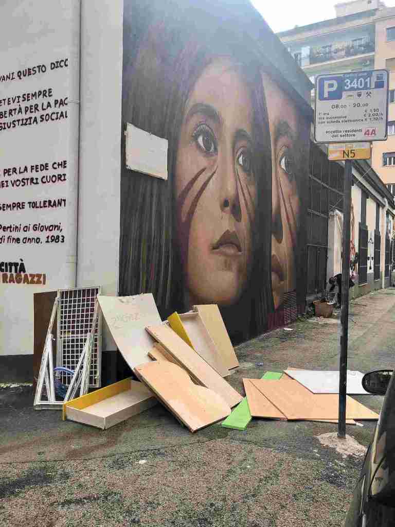 ” Non si salva neppure il murale realizzato dall’artista Jorit, con i ritratto di Ilaria Cucchi, opera inaugurata circa due anni fa, per l’esattezza il 20 novembre del 2018, alla presenza dell’artista e dela stessa Cucchi, con una manifestazione alla quale partecipò anche il sindaco di Napoli – ricorda Capodanno -. In questi giorni addossati al maxiritratto si osservano diversi ingombranti abbandonati, che invadono anche il marciapiede antistante: pannelli di legno, pezzi di mobili e anche uno stendibiancheria “.