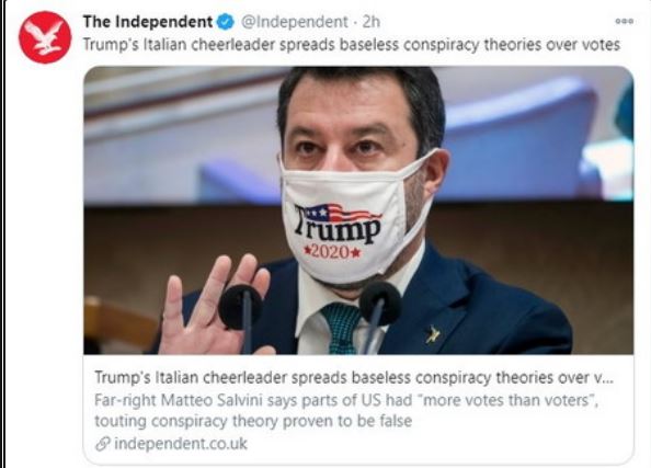 Tutto questo avrebbe dovuto far riflettere chiunque di noi, semplici cittadini senza alcuna responsabilità istituzionale, prima di indossare una mascherina con il suo nome. Matteo Salvini che è stato vice presidente del Consiglio e ministro dell’Interno e che potrebbe diventare il futuro presidente del Consiglio nella prossima Legislatura avrebbe dovuto mantenere un atteggiamento più neutrale se non altro nel caso in cui fosse l’altro candidato a vincere; come sembrano confermare il computo dei voti nei vari Stati.