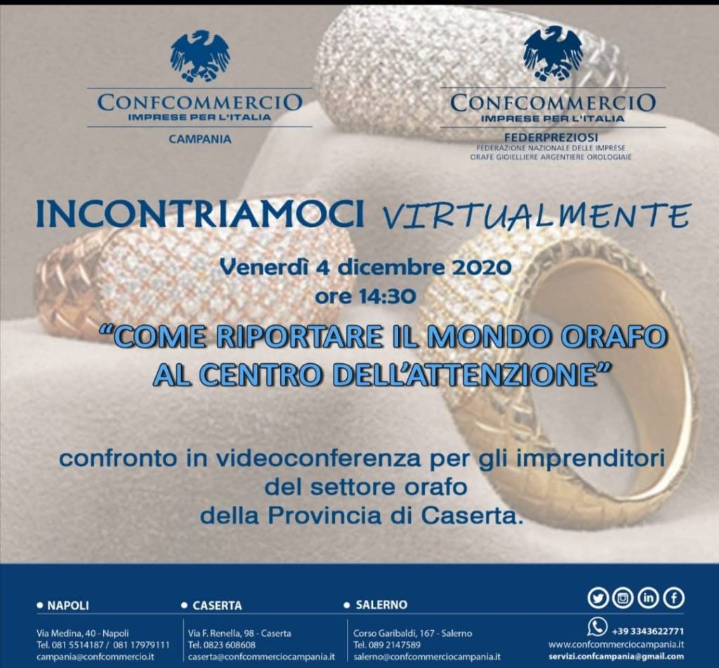 Sono 351 le aziende del settore orafo in provincia di Caserta. Venerdì 4 dicembre la videoconferenza organizzata da Federpreziosi Confcommercio