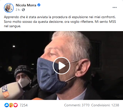 Sono anch’io molto triste per le espulsioni e soprattutto per quella di Morra, ma purroppo sono sacrosante! se la base ha detto di votare la fiducia a Draghi tu voti la fiducia a Draghi. Poi puoi dissentire in milioni di cose e rompere continuamente le scatole alle riunioni, ma il rispetto delle decisioni prese a maggioranza deve esserci altrimenti ognuno va per conto suo e non avrebbe senso neanche avere i partiti. Gli stessi capigruppo di camera e senato hanno chiaramente detto che il si del M5S non è incondizionato né scontato, allertando il PdC che verrà ben valutato ogni provvedimento.