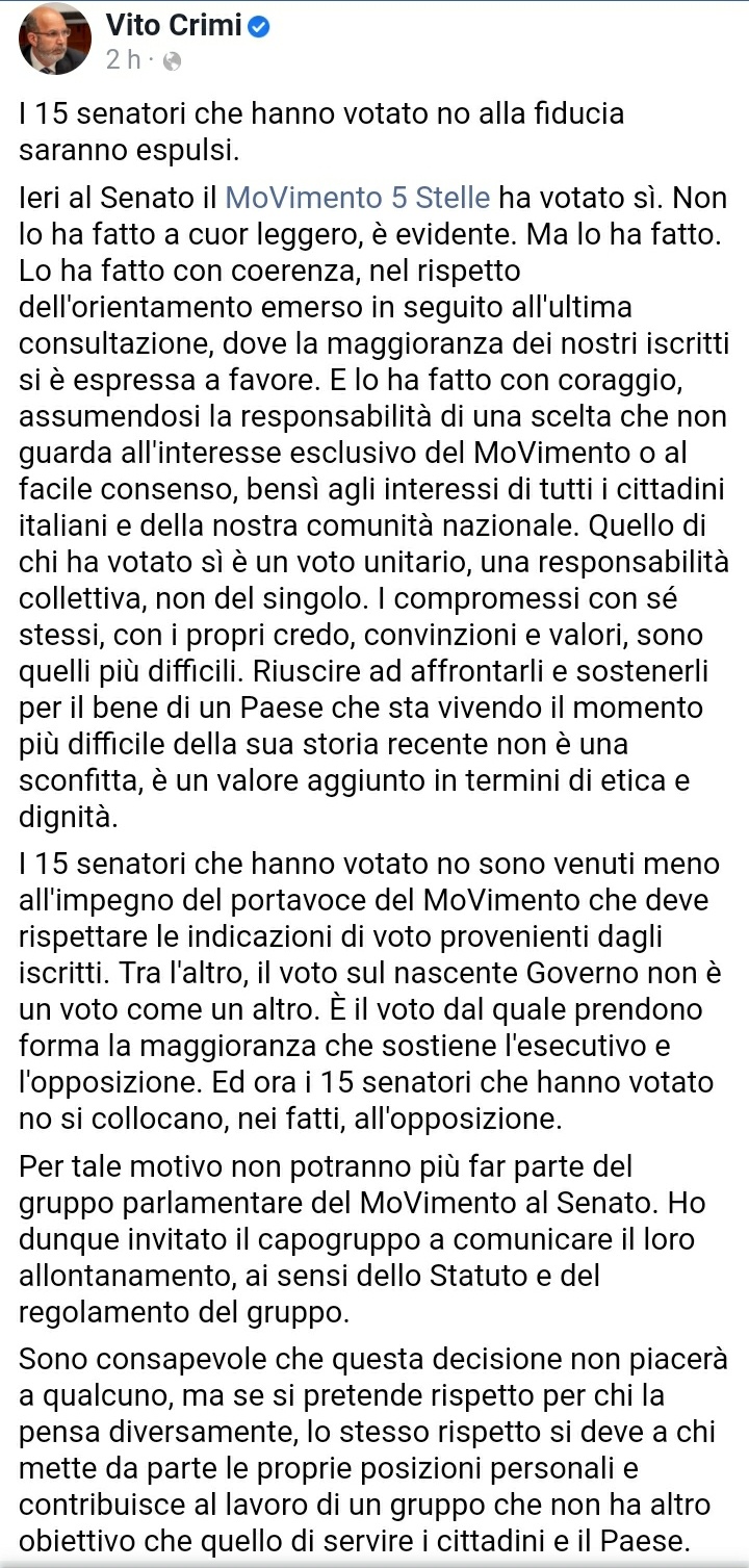 Se volevano degli “yes e così sia”, visto che si riempiono la bocca dello statuto, perchè non lo hanno messo in chiaro? Ora le espulsioni, in questo frangente, mi sembrano più una vendetta e togliere di mezzo il dissenso, più che la osservanza di una regola. Crimi è solo l’esecutore di altrui scelte.