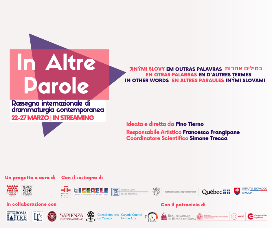 Quindici edizioni, finora: di oltre 100 testi presentati in prima nazionale, provenienti da ogni angolo del mondo, più di 30 sono stati realmente prodotti e messi in scena, alcuni anche più volte. Nel panorama italiano delle rassegne dedicate alla drammaturgia contemporanea, In Altre Parole resta decisamente la manifestazione più curiosa, più proficua, più concreta. Per questa nuova edizione tutta in digitale, verranno presentati sei appuntamenti dedicati all’eccellenza della drammaturgia internazionale, visibili dal 22 al 27 marzo in streaming, ogni sera dalle ore 20:00 sul canale YouTube di Argot Studio (youtube.com/user/ArgotStudioTV).
