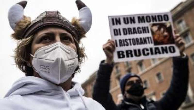 Arrivano da tutta Italia, uomini e donne, disperati, agguerriti, “allo stremo”; pochi indossano la tenuta da cuochi, qualcuno si traveste per attirare l’ attenzione, esibiscono simboliche manette, inalberano cartelli come quello nella foto di Angelo Carconi qui sotto: “In un mondo di Draghi i ristoranti bruciano”.