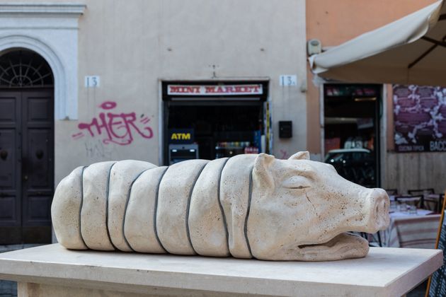 (Fulvio Abbate – Huffpost) – Con il simulacro di una porchetta, l’Arte povera quasi Alchemica è finalmente giunta con certezza a Roma. Ci aveva provato ad affermarla con vigore, già negli anni Settanta, l’attualmente assai discusso Gino De Dominicis, segnatamente con la sua “Mozzarella in carrozza”; e ancora altri maestri non meno titolati, tuttavia mai riuscendo pienamente nell’intento. L’impresa è riuscita invece a figure assai meno carismatiche, come coloro che hanno d’improvviso collocato in piazza San Giovanni della Malva, cuore e nervi di Trastevere, percorribili perfino in auto nella prospettiva di raggiungere il Gianicolo, non lontano dall’eponima trattoria “Da Checco er Carettiere”, ove venne scattata la foto che mostrava Gianni Minà accompagnato da García Márquez, Robert De Niro e Muhammad Ali e Sergio Leone. E ancora, sempre lì, da una finestra di un edificio a schiera, pochi anni addietro, Renato Zero donò addirittura ai passanti un concerto improvvisato; per dire quanto il luogo sia innervato con la romanità e benedetto dal “feroce Frascati”, nel senso del vino da accompagnare proprio alla carne di maiale, per dirla con Pasolini.