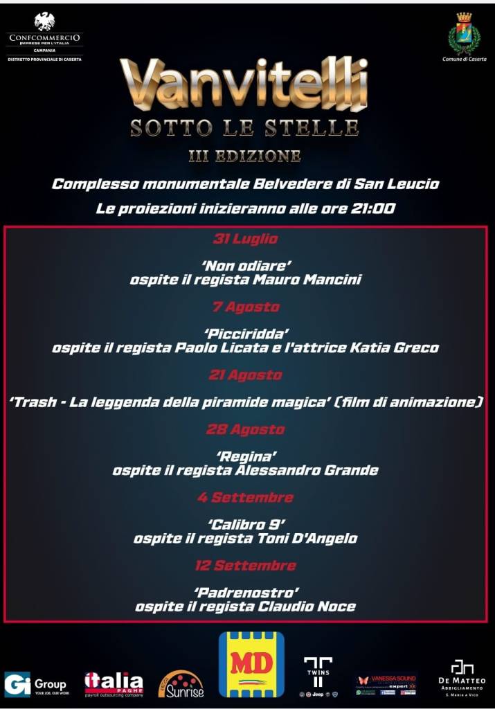 ‘Vanvitelli sotto le stelle’, si riparte. La rassegna di cinema all’aperto ideata da Confcommercio Caserta tornerà infatti ad animare anche quest’anno l’estate di chi resta in città. Sei serate di grande cinema, tutte ad ingresso gratuito, in programma dal 31 luglio al 12 settembre nello splendido scenario del Real Belvedere di San Leucio. Giunta alla terza edizione, la manifestazione – patrocinata dal Comune di Caserta – si candida a diventare dunque un vero e proprio Festival cinematografico con ospiti d’eccezione, riconoscimenti, premi e tante sorprese. Si parte sabato 31 luglio alle ore 20,30 con una serata evento che sarà presentata da Francesco Massarelli, direttore artistico della rassegna. Saranno presenti il presidente di Confcommercio Caserta, Lucio Sindaco, il sindaco di Caserta, Carlo Marino, l’assessore agli eventi Emiliano Casale. Il primo film in cartellone è ‘Non odiare’. Ospite della serata il regista Mauro Mancini che incontrerà il pubblico subito dopo la proiezione. Una storia vera, quella interpretata da Alessandro Gassmann, qui nel suo ruolo forse più bello e viscerale. Candidato a 4 Nastri d’Argento e 3 David di Donatello, il film è stato presentato lo scorso anno anche alla Settimana internazionale della Critica della Mostra del Cinema di Venezia. Racconta la storia di un medico ebreo che trovandosi di fronte al dilemma di salvare o meno un uomo che ha appena subito un incidente stradale, decide di abbandonarlo al suo destino quando scopre che ha una svastica tatuata in più parti del corpo. L’uomo sarà però dilaniato dai sensi di colpa, e cercherà di aiutare quel che resta della famiglia dell’uomo per rimediare al suo conflitto morale. Nel corso della serata di sabato 31 luglio ci saranno però anche altre sorprese cinematografiche tutte da scoprire. Secondo appuntamento sabato 7 agosto con il film ‘Picciridda’ tratto dall’omonimo romanzo di Catena Fiorello. Sul palco del Belvedere per l’occasione ci saranno il regista Paolo Licata e l’attrice Katia Greco. Una pellicola che racconta il fenomeno dell’emigrazione passiva negli anni Sessanta, ovvero quella di chi è rimasto nel luogo natale e deve fare i conti con il senso di abbandono e l’impossibilità di comunicare con i propri cari partiti. La rassegna proseguirà sabato 21 agosto con il cartoon ‘Trash – La leggenda della piramide magica’, opera prima di Luca della Grotta e Francesco Dafano che ambientano le loro creature di animazione in luoghi reali per dare vita ad una storia tenera e ispiratrice di riscatto che passa attraverso il riutilizzo dei rifiuti. Sabato 28 agosto riflettori accesi su ‘Regina’, liberamente ispirato a ‘Il complesso di Telemaco’ di Massimo Recalcati, con Francesco Montanari e Ginevra Francesconi. Ospite della serata sarà il regista Alessandro Grande. Presentato al Torino Film Festival, ‘Regina’ ha ottenuto anche una candidatura ai Nastri d’Argento. Una storia di formazione che, per una volta, vede il personaggio adulto più bisognoso di diventare grande di quello adolescente. Altro appuntamento interessante quello di sabato 4 settembre con il regista Tony D’Angelo che porterà al Belvedere di San Leucio il suo ultimo lavoro ‘Calibro 9’ interpretato da Marco Bocci, Ksenia Rappoport, Barbara Bouchet, Michele Placido e Alessio Boni. Un affresco impietoso sulla ndrangheta, fra le più influenti organizzazioni criminali al mondo, e soprattutto un omaggio a ‘Milano Calibro 9’, che ha fatto epoca nel 1972 e del quale questo film rappresenta il sequel. Gran finale il 12 settembre con ‘Padrenostro’ del regista Claudio Noce che incontrerà il pubblico casertano. Il film premiato a Venezia è un bellissimo e straziante ritratto di un rapporto padre-figlio. Con un magistrale Pierfrancesco Favino che per questa interpretazione ha ottenuto la Coppa Volpi. Tutte le proiezioni inizieranno alle ore 21,00. I biglietti per assistere alle proiezioni gratuite potranno essere ritirati a partire da martedì pomeriggio 27 luglio nei punti vendita dei partner della rassegna e precisamente nei supermercati MD di San Nicola la Strada, Casagiove, Tredici e Curti, da Vanessa Sound in via Tescione a Caserta, alla pizzeria Sunrise di via Roma a Caserta, alla concessionaria Twins Volkswagen di Marcianise, al negozio di abbigliamento De Matteo uomo di Santa Maria a Vico. Partner della rassegna anche le società Italia Paghe e Gi Group.