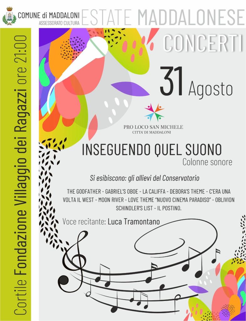 Martedì, 31 Agosto p.v., alle ore 21.00, nello storico Cortile della Fondazione Villaggio dei Ragazzi, si terrà l’evento musicale: “Inseguendo quel suono”. Organizzato dal Comune di Maddaloni nella persona dell’assessore alla cultura Caterina Ventrone, la manifestazione rientra nella serie di iniziative culturali denominata “Estate maddalonese” e vede la partecipazione anche della Proloco San Michele. La serata, che si caratterizzerà per l’esecuzione di un repertorio di musiche ad opera degli ex allievi del già Liceo Musicale Villaggio dei Ragazzi, sarà allietata dalla voce narrante di Luca Tramontano. “Prosegue a ritmo incalzante – ha dichiarato Felicio De Luca, Commissario straordinario della Fondazione Villaggio dei Ragazzi – la collaborazione con il Comune di Maddaloni e le varie associazioni territoriali per promuovere eventi culturali importanti per il territorio quale strumenti per il miglioramento della qualità della vita e della coesione sociale”.