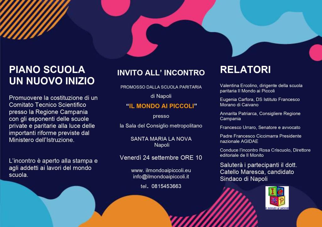 Venerdì 24 Settembre 2021 alle ore 10,00 presso la Sala del Consiglio metropolitano del complesso monumentale di S. Maria la Nova a Napoli, si svolgerà l’incontro “Piano scuola: un nuovo inizio”, con l’obiettivo di approfondire e discutere in merito a due riforme in arrivo da parte del Miur, preannunciate dal Ministro dell’Istruzione Patrizio Bianchi. La prima concerne le nuove modalità di reclutamento e di formazione continua del personale scolastico, compresi i dirigenti. Al personale si richiede infatti non solo la padronanza di adeguate competenze pedagogiche, ma anche capacità relazionali e di leadership nella gestione dei gruppi. La seconda riforma prevederà invece nuovi percorsi di inserimento lavorativo per i ragazzi degli Its, con l’obiettivo di ridurre il gap fra la formazione e i bisogni della nostra economia.