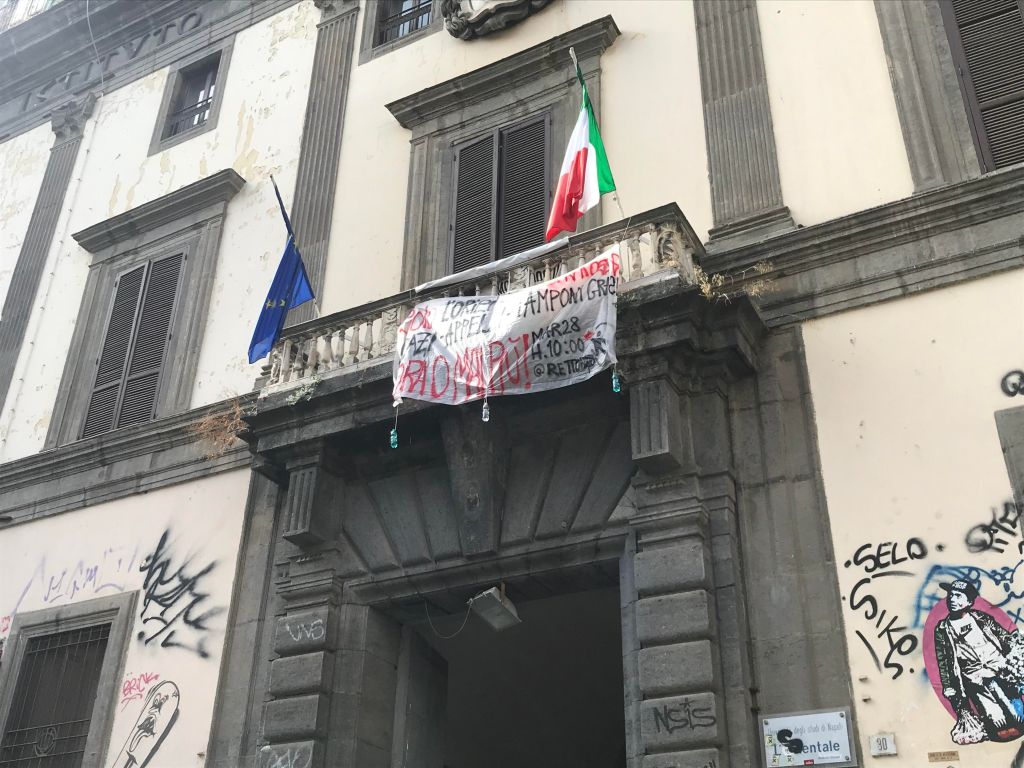Lo striscione recita:”Solo L’Orientale in Zona Rossa – Spazi – Appelli – Tamponi Gratis. Ora o Mai più! MART 28 H 10:00 @ RETTORATO”