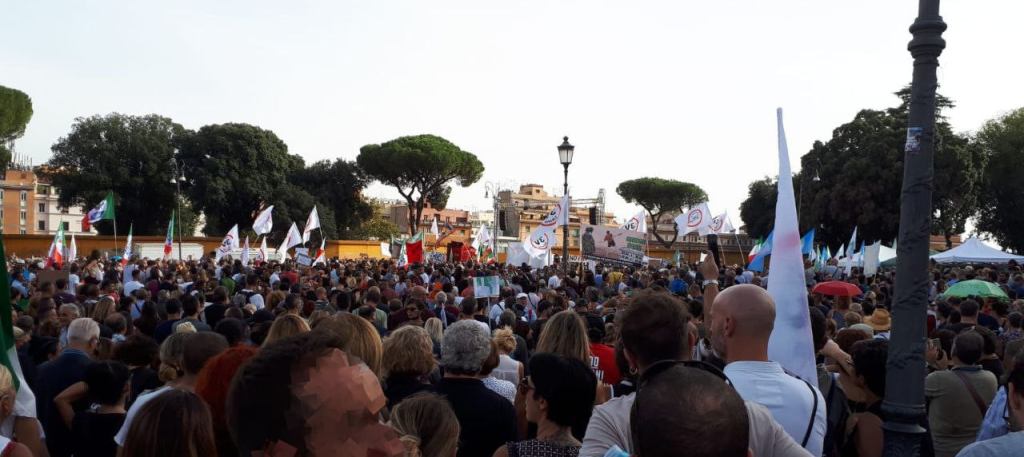 (Pino Cabras) – Nessun grande giornale on line, nessun telegiornale, nessun talk show. Nessuno ai piani alti del giornalismo italico ha parlato della più vasta delle manifestazioni popolari contro il lasciapassare verde che si sono tenute oggi in tante città: quella di Roma, con una piazza San Giovanni piena come non la si vedeva da tanto tempo. Qui e lì, per la verità, sui giornaloni qualche vago sfottò lo si legge pure, unicamente per evocare una misteriosa presenza di qualche sparuta formazione neofascista diluita in dosi omeopatiche in una folla sterminata che invece cantava canzoni antifasciste all’ombra di una gigantografia di Sandro Pertini, che sparisce nel tragitto dalla piazza alle redazioni.