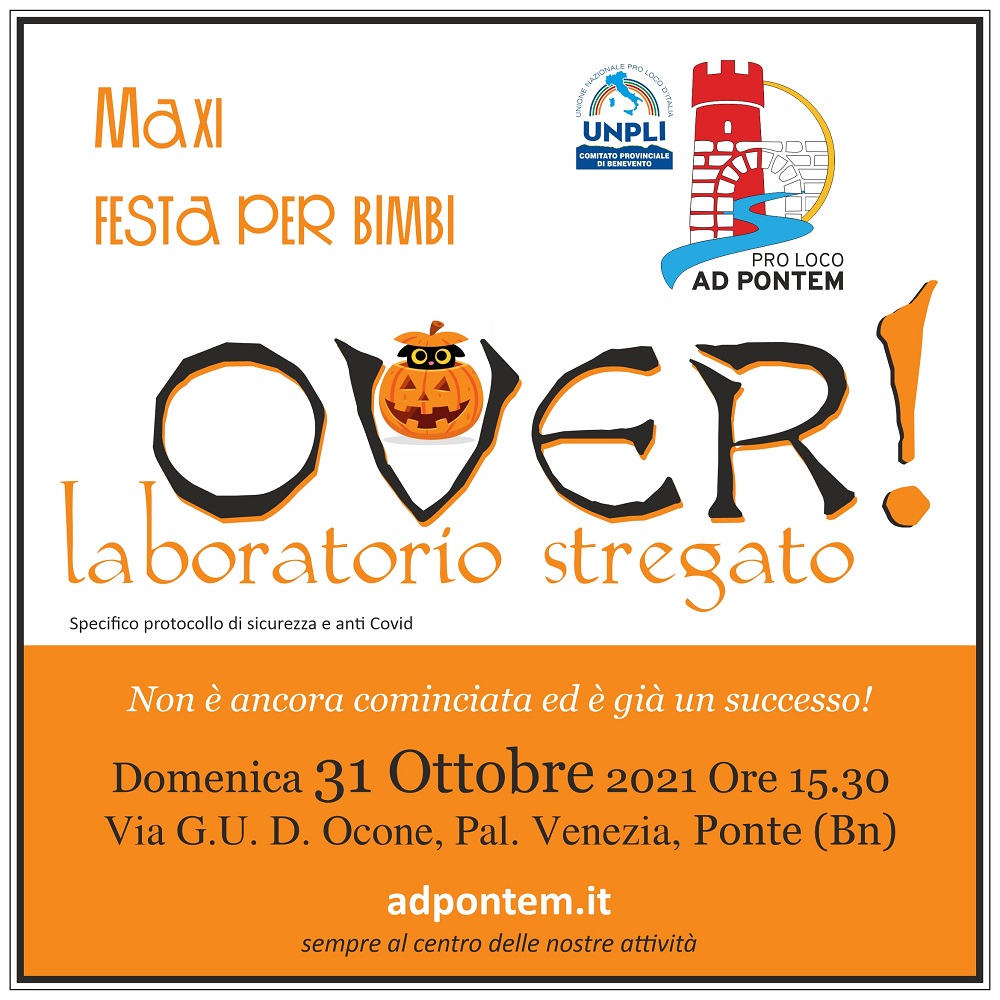 “OVER! Il “laboratorio stregato” della Pro Loco AD PONTEM di Ponte (Bn) è una  maxi festa per bimbi, nel rispetto delle norme di sicurezza e anti covid. Si terrà domenica 31 ottobre ore 15.30 a Ponte in un apposito locale attrezzato per l’occasione.