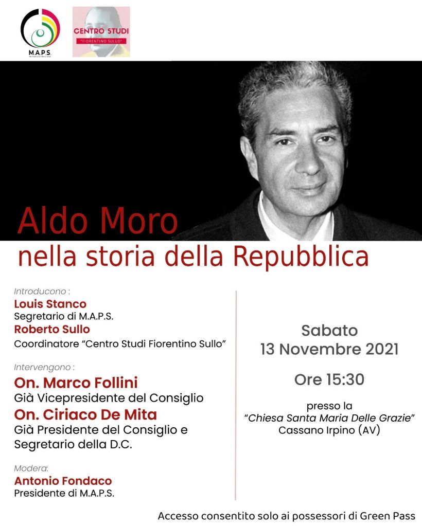 Il M.A.P.S. (Movimento attivo politico e sociale ) e il Centro Studi “Fiorentino Sullo” organizzano per sabato 13 Novembre dalle ore 15.30 nella Chiesa di Santa Maria delle Grazie a Cassano Irpino un convegno sulla figura di Aldo Moro nella storia della Repubblica.