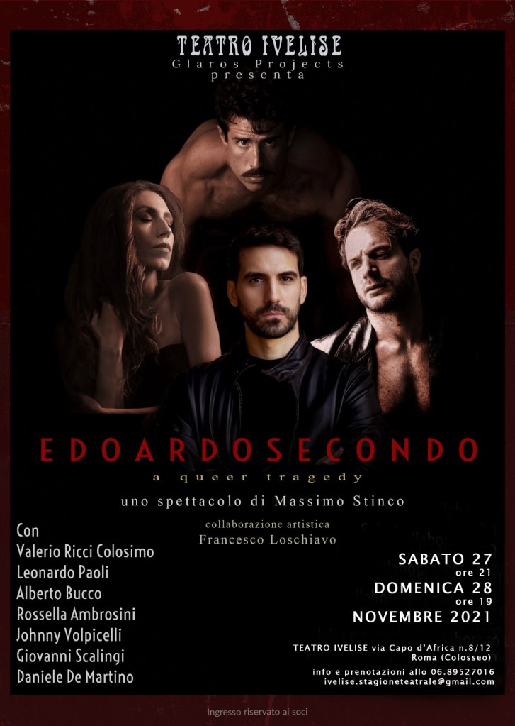 “Edoardosecondo – A queer tragedy” debutterà sul palco del Teatro Ivelise sabato 27 alle ore 21.00, replicando e domenica 28 novembre alle ore 19.00. Lo spettacolo del regista fiorentino Massimo Stinco, da anni esponente di “omoteatro”, porta in scena la storia ispirata al film di Jarman, con la palese intenzione di omaggiarlo a 30 anni dalla prima del suo film. Quello che interessa non è la tragedia politica quanto quella privata di re Edoardo , il dramma dell’amore di Edoardo per il suo amante Gaveston , amore ostacolato, bandito dal Potere di uomini omofobi . Lo spettacolo riduce la tragedia di Marlowe a soli quattro personaggi principali e la durata di 80 minuti . Come fece Jarman nel suo film, anche qui il testo viene completamente decontestualizzato, reso universale e senza tempo. Scelta sottolineata dai costumi e dalla colonna sonora contemporanei. Altra scelta del regista toscano è l’attenzione rivolta alle coreografie e al movimento scenico.
