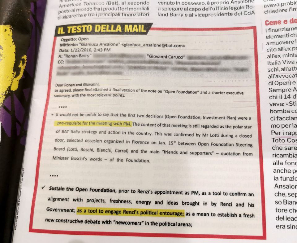 “Sostenere Open, prima della nomina di Renzi come premier, come strumento per confermare un allineamento con i progetti, la freschezza, l’energia e le idee portate avanti da Renzi ed il suo Governo; come strumento per impegnare l’entourage politico di Renzi; per stabilire un nuovo, attuale dibattito costruttivo con i nuovi arrivati nell’arena politica”. La Bat ha versato nelle casse di Open 170.000 euro.