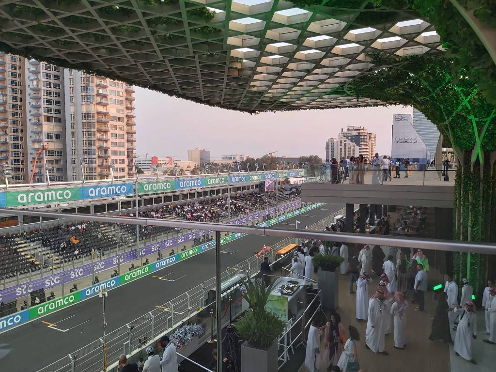 Al secondo piano del Paddock Club, sopra i box delle auto, al ristorante mangiavano le signore e i signori sauditi, questi ultimi molto eleganti con l’abito ufficiale detto thobe e le sneakers ai piedi. Si poteva vedere la gara anche da qui.