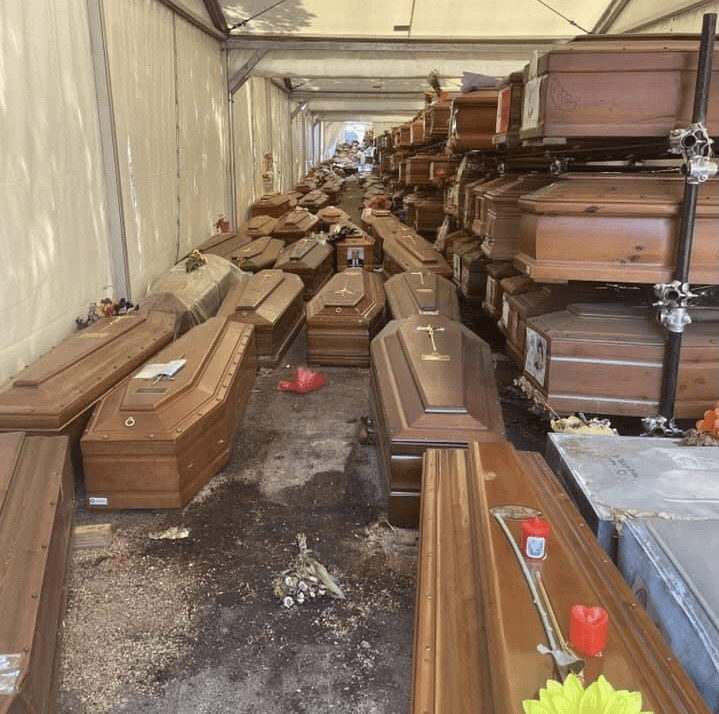 Ci sono stata mercoledì 15 dicembre e ne ho contate 347, disposte a filari di tre, una sopra l’altra. Qualcuna appoggiata o dimenticata a terra. Un odore acre, cattivo. Ti entra nelle narici, ma ti uccide l’anima. E poi mosche e moschini, a zonzo tra le bare, la sporcizia sotto di esse e i pochi fiori sventrati dal tempo. Restano le foto a colori di uomini e donne sorridenti a raccontarti un’ingiustizia senza fine: Alfredo, morto il 15 luglio 2020 e nello stesso anno Giuseppe, il 5 giugno, Michela il 23 ottobre, Attilio il 20 agosto, Matteo il 7 luglio, Elisabetta il 17 agosto, Vincenzo, il 17 giugno, Gabriele il 29 maggio, Maurizio il 5 settembre, Benedetto il 29 giugno….