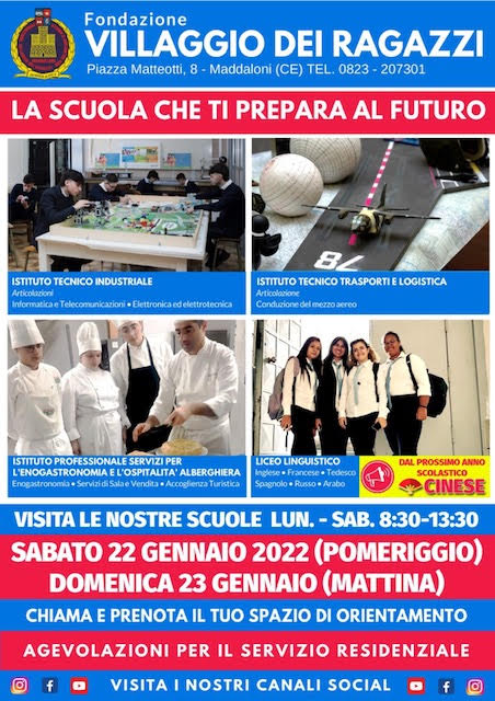 Sabato 22, dalle ore 15.30 alle ore 19.00, e Domenica 23 gennaio 2022, dalle ore 9.00 alle ore 13.00, le Scuole Superiori del Villaggio dei Ragazzi apriranno le porte agli studenti delle terze medie e alle loro famiglie. Accompagnati dal personale appositamente predisposto, gli interessati potranno conoscere, per l’occasione, la variegata offerta formativa che ha reso le Scuole dell’Opera tra le migliori nella classifica Eduscopio 2021 della Fondazione Agnelli, il cui obiettivo è anche quello di supportare i ragazzi nella scelta del percorso di studi una volta terminate le scuole secondarie di primo grado. Quattro gli indirizzi di studio che saranno messi in evidenza: l’Istituto Tecnico Industriale, con l’indirizzo di studio in Elettronica – Elettrotecnica ed Informatica e Telecomunicazioni; l’Istituto Tecnico Aeronautico, con l’indirizzo di studio in Conduzione del mezzo aereo; il Liceo Linguistico, con lo studio delle diverse lingue (Inglese, Francese, Tedesco, Spagnolo, Arabo, Russo e Cinese) e l’Istituto Professionale Alberghiero, con l’indirizzo in enogastronomia, accoglienza turistica e servizi di sala e vendita. Nel corso dell’evento saranno presentati anche gli ambienti scolastici di notevole metratura, tali da riuscire ad ospitare molti più studenti che attualmente li frequentano, i docenti, le attività laboratoriale e il Servizio Residenziale. In particolare, il “Residenziale”, da sempre fiore all’occhiello dell’Istituzione calatina, ubicato in una Palazzina di origine borbonica situata all’interno del “Villaggio”, è in grado di accogliere, 24 h al giorno e tutti i giorni dell’anno scolastico (sabato incluso), i ragazzi comunitari ed extracomunitari, tra i 14 e i 18 anni, provenienti dal territorio campano e non solo. I giovani che sceglieranno la formula “residenziale”, oltre ad espletare un’intensa attività di studio post scuola, usufruiranno anche di importanti agevolazioni e di un servizio mensa completo che assicurerà cibo sano e nutriente. “Il crescente interesse mostrato da genitori e figli alla nostra ricca offerta formativa proposta nelle scorse giornate di orientamento mi fa ben sperare in termini di nuove iscrizioni. La buona istruzione è fondamentale per le generazioni future di questi territori perché grazie ad essa ci si può affermare personalmente e si può migliorare la qualità della vita di una intera Comunità”, ha affermato il dott. Felicio De Luca, Commissario Straordinario della Fondazione.