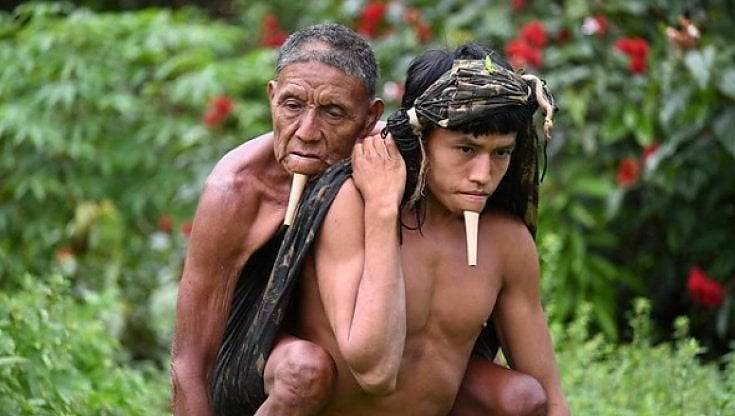 Il figlio porta sulle spalle il padre per farlo vaccinare. Viaggio lungo 12 ore degli ultimi indigeni