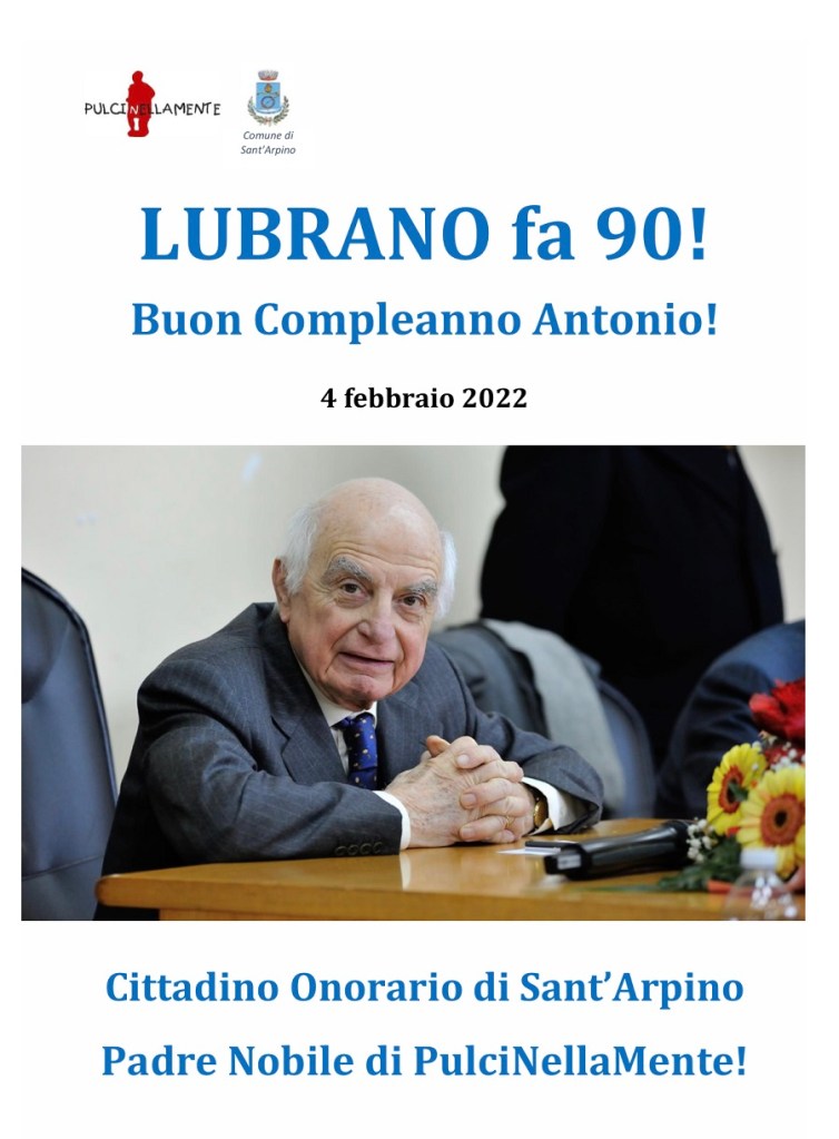 “Lubrano fa 90, Buon Compleanno Antonio“: Sant’Arpino festeggia il novantesimo compleanno del grande giornalista Antonio Lubrano, legato a doppio filo alla cittadina casertana per essere da oltre un decennio il “Padre nobile di PulciNellaMente” nonché “cittadino onorario” della medesima comunità che vanta di aver dato i natali al teatro italico con le Fabulae Atellanae.
