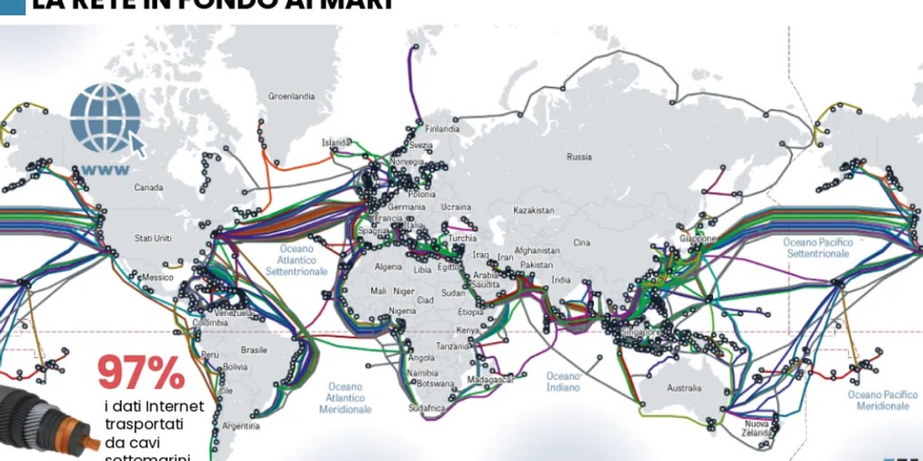 Il 97% del traffico online passa sui fondali in 426 cavi lunghi 1,2 milioni di chilometri. Ogni giorno passano scambi finanziari pari a 10 trilioni di dollari oltre a un’enorme quantità di informazioni. Il loro controllo è conteso tra i grandi del mondo e i colossi del web, che investono capitali immensi, con il rischio di sabotaggio.