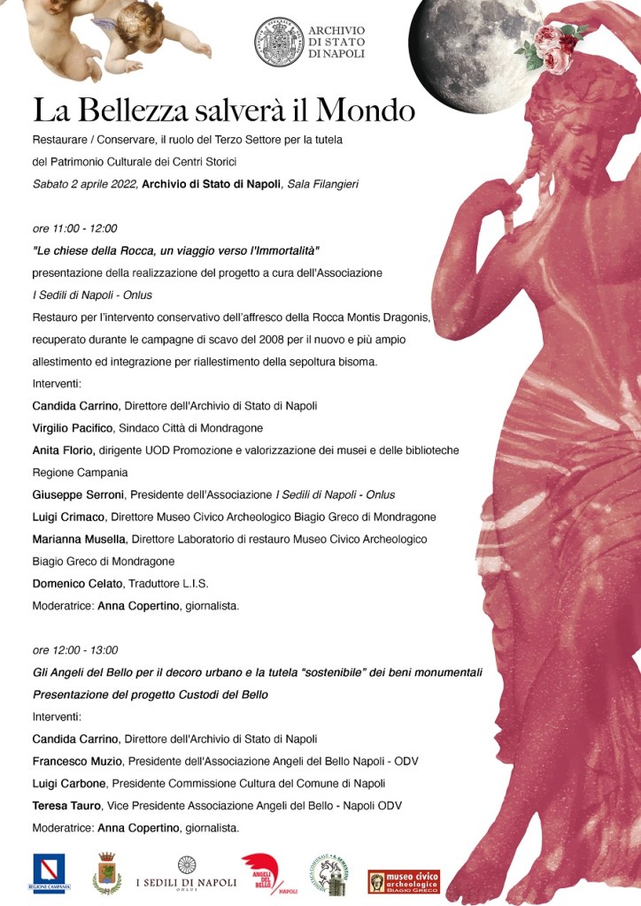 Interverranno: Candida Carrino, Direttrice dell’Archivio di Stato di Napoli, Francesco Muzio, e Teresa Tauro, rispettivamente Presidente e Vicepresidente dell’Associazione Angeli del Bello ODV; Luigi Carbone, Presidente della Commissione Cultura del Comune di Napoli e porteranno i saluti dell’Amministrazione Comunale, il Vicesindaco Maria Filippone e l’Assessore alle Infrastrutture, Edoardo Cosenza.
