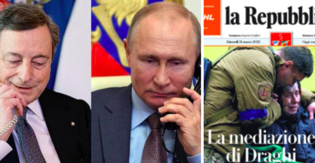 (Luca Telese – tpi.it) – “La mediazione di Draghi”, titolava aulicamente Repubblica, stamattina. Sottotitolo: “in un’ora di colloquio al telefono il premier chiede: ‘Ridurre gli attacchi favorirà la tregua”. E questo era il giornale con la sintesi del Draghi di un giorno prima: imperativo, definitivo, secco. Il contenuto speciale sulla trattativa del presidente del Consiglio veniva presentato ai lettori di La Repubblica così: “Il nostro titolo di apertura, ‘La mediazione di Draghi’, descrive il ruolo fondamentale del nostro premier nella partita diplomatica per trovare la pace in Ucraina. In quasi un’ora di colloquio con Vladimir Putin – spiegava La Repubblica – Draghi offre il suo impegno a contribuire al processo di pace”.