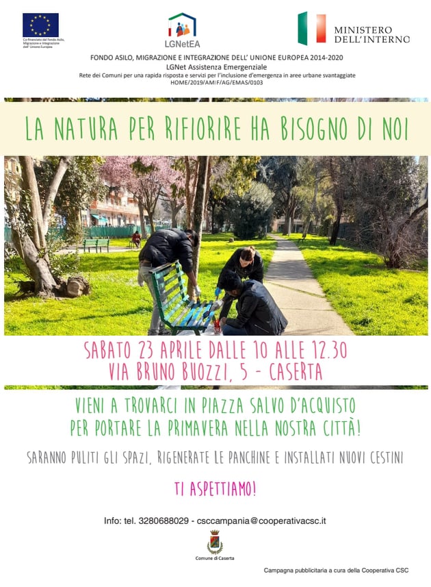 Il rione Tescione a Caserta torna protagonista con un nuovo intervento di rigenerazione urbana promosso dalla cooperativa ‘Csc – Credito senza confini’ nell’ambito del progetto LGNet. Dopo i risultati ottenuti due mesi fa in piazza Cavour – dove cittadini italiani e stranieri si sono rimboccati le maniche per tagliare l’erba, piantare alberi, verniciare panchine, installare cestini – il gruppo si sposterà questa volta nella vicina piazzetta Salvo D’Acquisto per ripulire gli spazi verdi e fare piccoli interventi di manutenzione ordinaria. L’appuntamento è già fissato per sabato 23 aprile alle ore 10. Saranno presenti gli abitanti del quartiere, i volontari della chiesa di San Pietro in Cattedra guidata dal parroco don Gianmichele Marotta, i minori stranieri non accompagnati ospiti delle strutture di Cidis onlus e i maggiorenni accolti nell’ambito del Sai (Sistema di accoglienza e integrazione) ‘Mille soli’ di Caserta. Tutti insieme uniranno le forze per restituire vivibilità ad un’area di periferia che versa in condizioni di degrado. ‘Si tratta di una iniziativa che persegue un duplice obiettivo – spiega don Gianmichele Marotta – da un lato sensibilizzare e responsabilizzare la comunità sulla gestione dei beni comuni, dall’altro riqualificare e valorizzare uno spazio – che in passato è stato anche vandalizzato – affinché possa tornare fruibile per i bambini e le loro famiglie. Attualmente infatti questa piazzetta è utilizzata quasi esclusivamente come uno sguinzagliatoio per cani. E quasi mai vengono rimossi rifiuti, sporcizia e deiezioni. Speriamo quindi con questo intervento di dare un input a tutta la collettività e di inaugurare una serie di buone pratiche del vivere civile’. LGNet è un progetto ministeriale di Assistenza emergenziale, finanziato dal Fami (Fondo asilo migrazione e integrazione) dell’Unione europea che mira a favorire l’inclusione sociale attraverso interventi di rigenerazione urbana, protezione ambientale e responsabilità comune. All’evento di sabato è stata invitata anche l’amministrazione comunale in quanto ente capofila del progetto.
