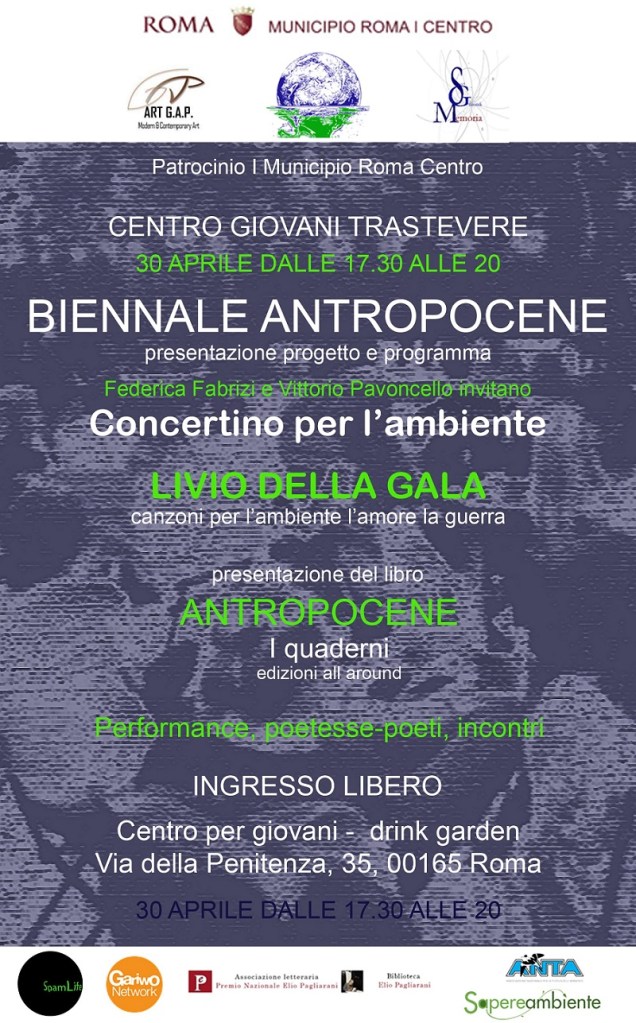 La presentazione del progetto e del programma della I Biennale dell’Antropocene per la stampa e per il pubblico ci sarà nel drink garden sabato 30 aprile dalle 17 alle 20 presso il Centro Giovani del Comune di Roma di Via della Penitenza 35.Durante l’incontro in prossimità del 1° maggio Livio Della Gala eseguirà Il concertino per l’ambiente. Sarà presentato in anteprima il libro Antropocene I quaderni con letture di alcuni brani, che raccoglierà in seguito tutti gli eventi delle biennali.