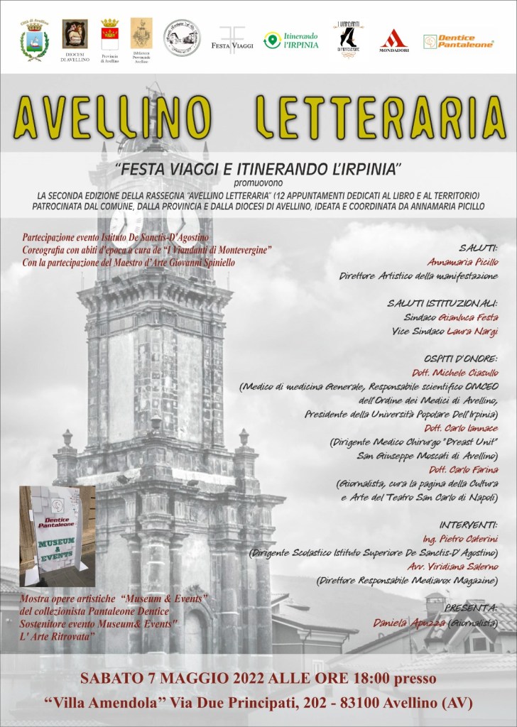 Sabato 7 maggio alle 18, presso Villa Amendola, sarà presentata la II° edizione della rassegna Avellino Letteraria. L’evento patrocinato dal Comune, dalla Provincia e dalla Diocesi di Avellino, è promosso da Festa Viaggi, Itinerando l’Irpinia, organizzato da Annamaria Picillo, direttore artistico, comincerà ufficialmente il 28 maggio e si concluderà il 17 dicembre.