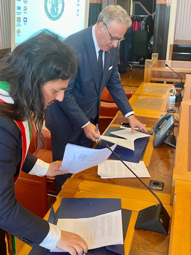‘L’accordo di oggi prevede la consegna all’Università in comodato d’uso gratuito di un bene confiscato alla camorra – ha spiegato il sindaco Della Ragione -. Villa Ferretti, alle pendici del castello aragonese di Baia, è un bene mai aperto alla città da quando è stato confiscato nel 1997. È entrato a far parte del patrimonio comunale nel 2001, oggi è un parco pubblico con una spiaggia e a breve sarà anche un Polo Universitario. Portiamo per la prima volta a Bacoli e nei Campi Flegrei l’Università, per l’Archeologia del mare e per l’alta formazione. Questo ci permetterà di incentivare un turismo di qualità, di élite, in una frazione come quella di Baia che ha il Parco Archeologico sommerso più importante del mar Mediterraneo proprio di fronte a villa Ferretti, una struttura ottocentesca che insiste su una antica villa romana che è in parte visibile e in parte sott’acqua. Non esiste progresso e sviluppo di qualità senza una vera e propria rivoluzione culturale, il ruolo dell’università, da questo punto di vista, è fondamentale. Noi avremo a Bacoli, in una comunità di 26000 abitanti, un flusso scolastico dalle materne fino all’università e ci inorgoglisce questo processo che mette insieme, il Comune, l’Università Federico II, ma anche la Soprintendenza ai Beni Archeologici e il Parco Archeologico dei Campi flegrei perché villa Ferretti si trova sotto il Museo Archeologico dei Campi Flegrei, inaugurato nel 2008 da Giorgio Napolitano, allora Presidente della Repubblica, che lo identificò come il museo più bello d’Italia. C’è una sinergia forte tra tutti gli attori culturali del nostro territorio: oggi tutti insieme puntiamo ad una valorizzazione vera, con gli imprenditori, con il mondo privato, attraverso la scuola e la formazione che è fondamentale in un reale processo di rigenerazione soprattutto dopo la pandemia’.
