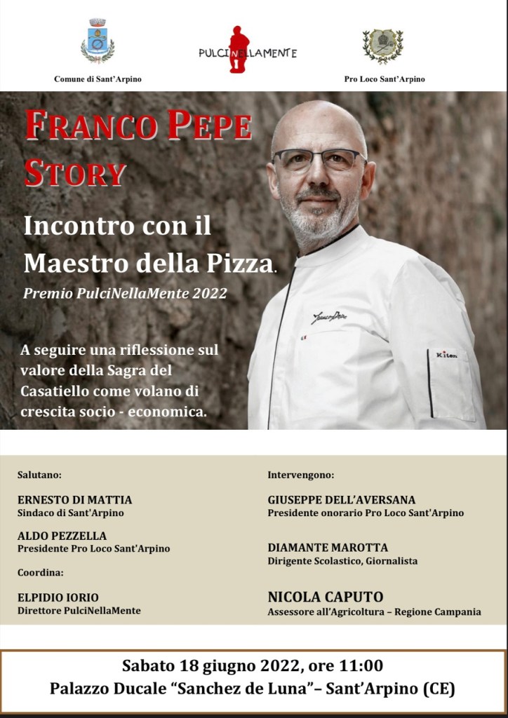 A Franco Pepe, tra i maestri della pizza più famosi al mondo, il Premio PulciNellaMente 2022. Il riconoscimento sarà conferito nell’ambito di una cerimonia che si terrà sabato prossimo, 18 giugno 2022, a partire dalle ore 11.00, presso il Salone dei Busti di Palazzo Ducale “Sanchez de Luna” a Sant’Arpino.