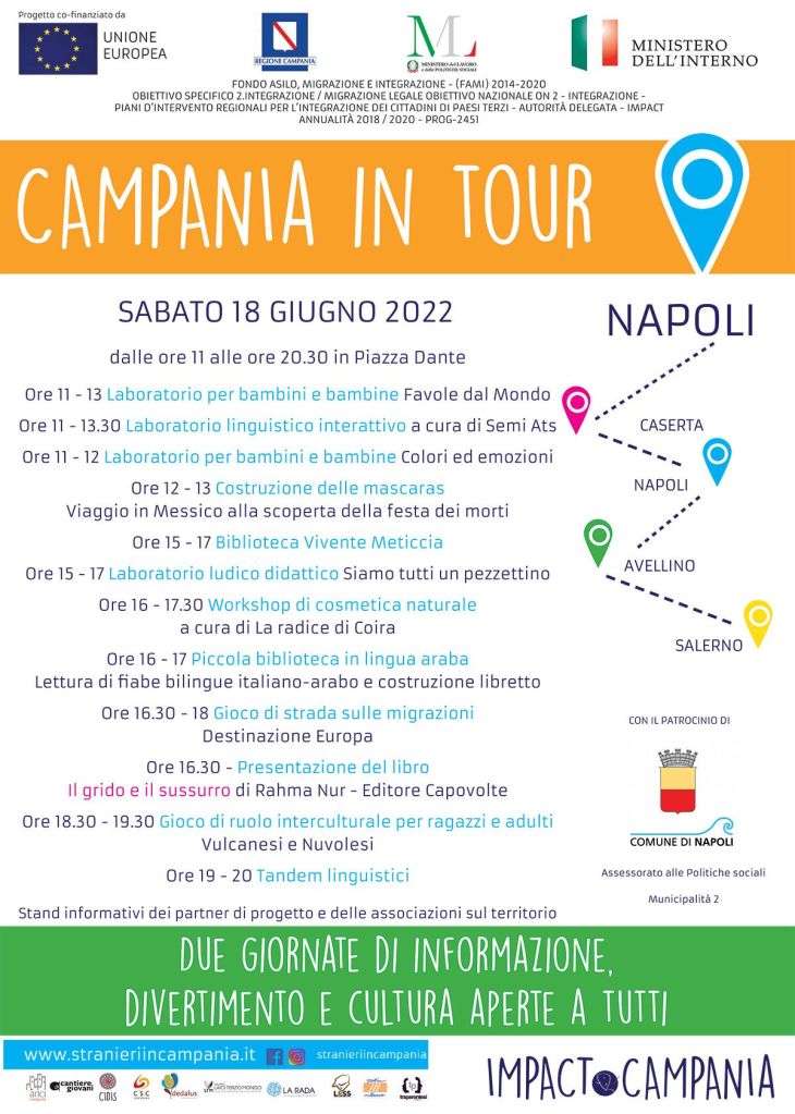 Il Campania in Tour è realizzato nell’ambito di Impact Campania, un progetto che comprende una serie di attività tra loro complementari con l’obiettivo di favorire l’integrazione dei cittadini stranieri nella regione attraverso la qualificazione del sistema scolastico in contesti multiculturali, la promozione dell’accesso ai servizi per l’integrazione e la maggiore partecipazione delle comunità immigrate ad attività di animazione sociale e narrazione dei cambiamenti sociali sul territorio.