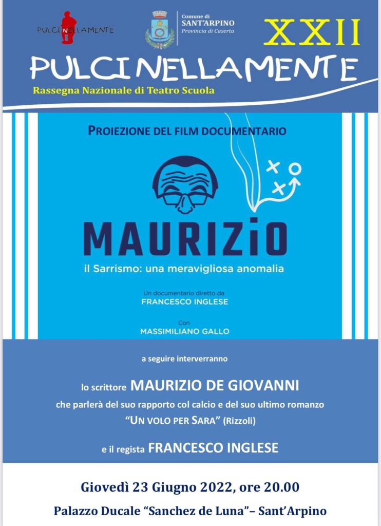 “Maurizio – il Sarrismo: una meravigliosa anomalia”. E’ il titolo del film documentario, nato da un’idea di Rino Pinto e Francesco Inglese, che sarà proiettato nel prossimo incontro di PulciNellaMente che si terrà giovedì prossimo, 23 giugno 2022, a partire dalle ore 20.00, presso il Salone dei Busti di Palazzo Ducale “Sanchez de Luna” a Sant’Arpino.