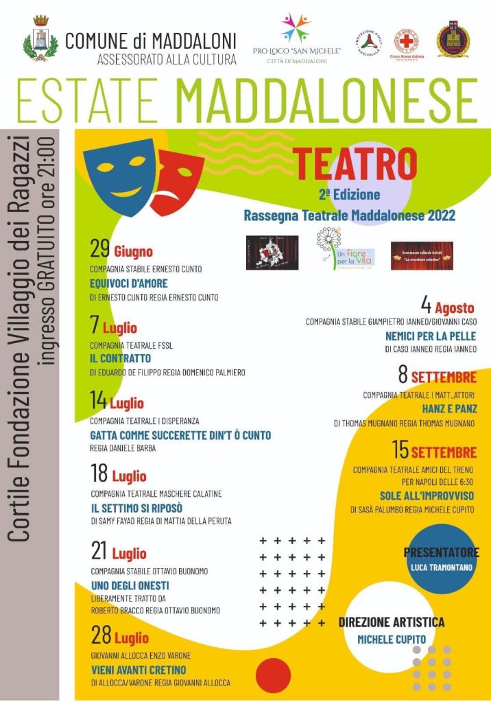 Dopo il grande successo riscosso lo scorso anno ritorna, anche questa estate, la rassegna teatrale alla Fondazione Villaggio dei Ragazzi “don Salvatore d’Angelo”. Su iniziativa dell’Assessorato alla Cultura del Comune di Maddaloni, retto da Caterina Ventrone, il “Villaggio” diventerà, infatti, dal 29 giugno p.v. al 15 settembre, luogo d’ arte teatrale sotto l’attenta direzione artistica di Michele Cupito. L’attore maddalonese ha allestito per l’occasione un cartellone ricco non solo
