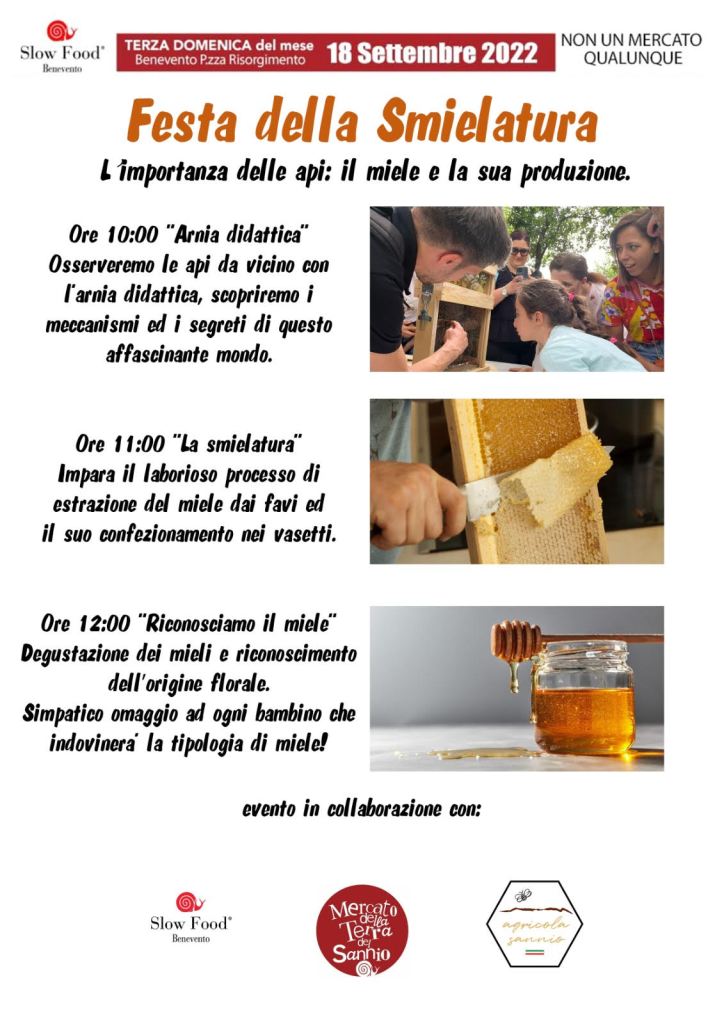 Ad arricchire il programma di questa edizione – la prima dopo la pausa estiva –, la Festa della Smielatura organizzata in collaborazione con Agricola Sannio. A partire dalle ore 10, Carmine Luciani dell’Agricola Sannio, socio della condotta Slow Food di Benevento, ci guiderà alla scoperta delle api e del loro mondo, oltre che del miele prodotto grazie all’opera instancabile di questi preziosi insetti impollinatori. In chiusura, alle ore 12, degustazione di varie tipologie di mieli.