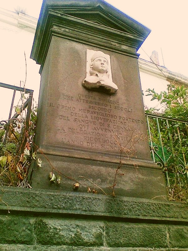 “ La tradizione popolare – sottolinea Capodanno – vuole che il miracolo sia stato determinato dall’incontro tra la testa e il sangue del Santo. L’evento viene ricordato sia da un altorilievo, dove si osserva Eusebia che, genuflessa, dona le ampolle al Vescovo che guida la processione, altorilievo che si trova nella Basilica in via S. Gennaro ad Antignano, una delle tre chiese, insieme a quella di San Gennaro al Vomero, in via Bernini, e a quella di San Gennariello o della Piccola Pompei, la più antica delle tre, posta in via Cifariello, dedicate al santo nell’ambito del territorio del quartiere collinare, sia dal cippo che nel 1941 venne posto dalla delegazione pontificia a poca distanza dalla stessa Basilica, dove sarebbe avvenuto il primo miracolo ” .