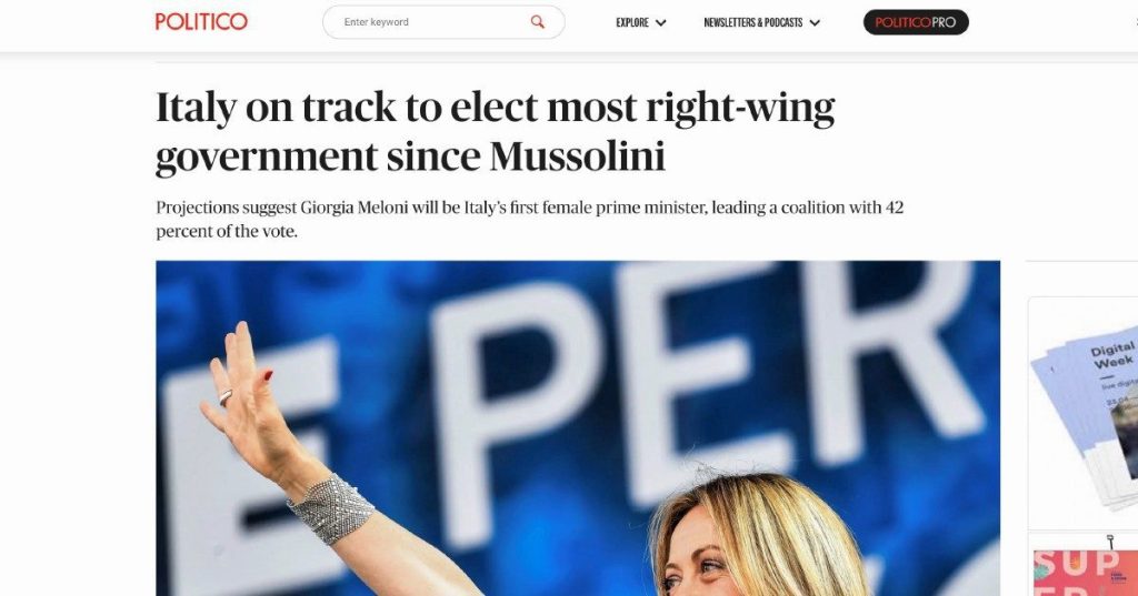(DI SALVATORE CANNAVÒ – ilfattoquotidiano.it) – I titoli sulla stampa estera che più colpiscono sono quelli di Politico.eu, il quotidiano più letto dall’establishment europeo, e del Washington Post. “L’Italia è sulla buona strada per eleggere il governo più di destra dopo Mussolini” dice il primo; “L’Italia sta per avere il primo governo di estrema destra da Mussolini”, il quotidiano di Washington.