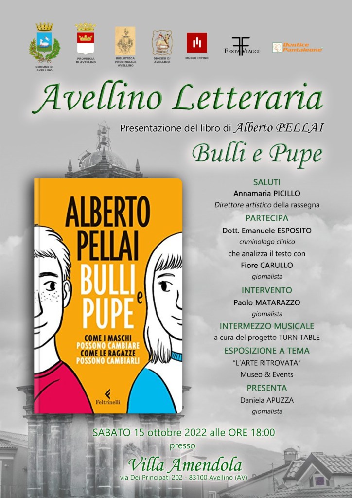 Nella storica Villa Amendola, nuovo appuntamento con la rassegna “Avellino Letteraria” ideata ed organizzata da Annamaria Picillo, direttore artistico dell’evento. Sabato 15 ottobre alle 18, sarà presentato il libro, di Alberto Pellai, “Bulli e Pupe” edito Feltrinelli. Il Nostro, svolge l’attività di medico, psicoterapeuta dell’età evolutiva, ricercatore presso il dipartimento di Scienze biomediche dell’Università degli Studi di Milano. Ha vinto numerosi premi letterari, e nel 2004, il Ministero della Salute gli ha conferito la medaglia d’argento al merito in Sanità pubblica. È autore di molti libri di parenting e psicologia. Il testo Bulli e Pupe, come i maschi possono cambiare, come le ragazze possono cambiarli, è un libro per giovani uomini in formazione, che partendo dai falsi miti che spesso condizionano la crescita dei giovani maschi, abbatte stereotipi di genere e aiuta ad acquisire un pensiero critico verso modelli di identità. Un invito rivolto al genere maschile a sentire quali emozioni sperimentano di fronte alle cose importanti della vita, sentire la voce delle ragazze, che parlano in questo libro e soprattutto udire la parte più vera di se stessi, l’unica che li può aiutare a diventare ciò che davvero vogliono essere. Partecipa all’incontro, il dottore Emanuele Esposito, criminologo clinico, che analizza il testo con il giornalista Fiore Carullo. Contributo del giornalista, sociologo, Paolo Matarazzo. Intermezzo musicale a cura del progetto Turn Table. Esposizione a tema de “L’arte Ritrovata” Museum & Events. Coordina l’evento la giornalista Daniela Apuzza.