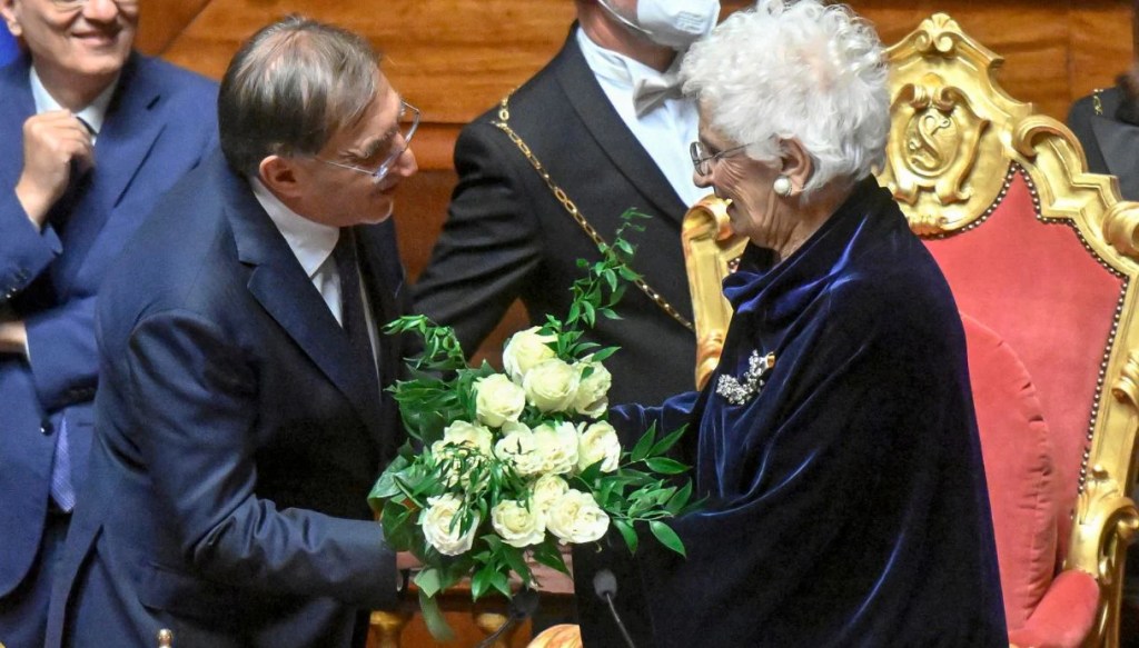 Il passaggio del testimone, quasi una consegna generazionale, avviene nel simbolismo più doloroso e angosciante: la testimone di Auschwitz, Liliana Segre, colei che porta, indelebile, il numero marchiato sul suo braccio, colei che bambina fu espulsa dalla scuola elementare, dalla sua classe e dalla sua vita, oggi è costretta a consegnargli il Senato repubblicano.