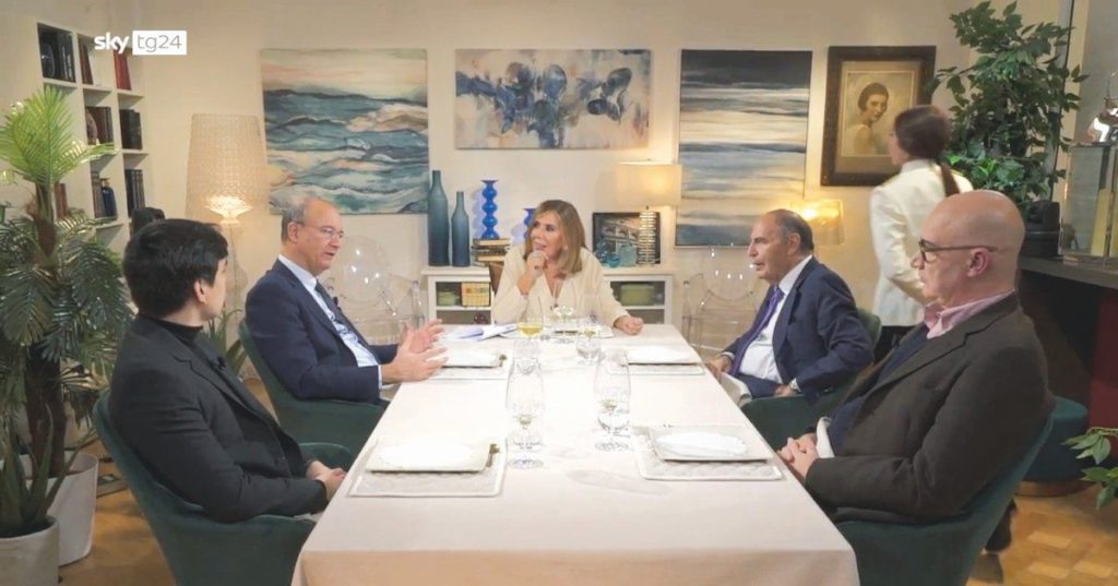 L’ultima uscita pubblica vede Valditara seduto a tavola sul set di un assurdo programma di SkyTg24, “A cena da Maria Latella”, in cui lui e altri commensali discettano amabilmente di scuola mentre mangiano. “Il bullismo, l’indisciplina, la disattenzione, il ragazzo che gioca col cellulare… Limitarsi alla sospensione cosa vuol dire? L’idea dei lavori socialmente utili che ti educano alla responsabilità, invece!” dice il ministro togliendosi i filacci dai denti con la lingua. Bruno Vespa, facendo la scarpetta: “Una punizione non potrebbe essere quella di fargli passare 4 ore da solo in biblioteca?”. Latella, a capotavola: “No, è meglio fargli pulire le aule!”. Una scena raccapricciante di puro sadismo che pare presa da Salò o le 120 giornate di Sodoma, o da quel film di Buñuel in cui degli insulsi borghesi pronunciano fatuità a tavola seduti sui water.