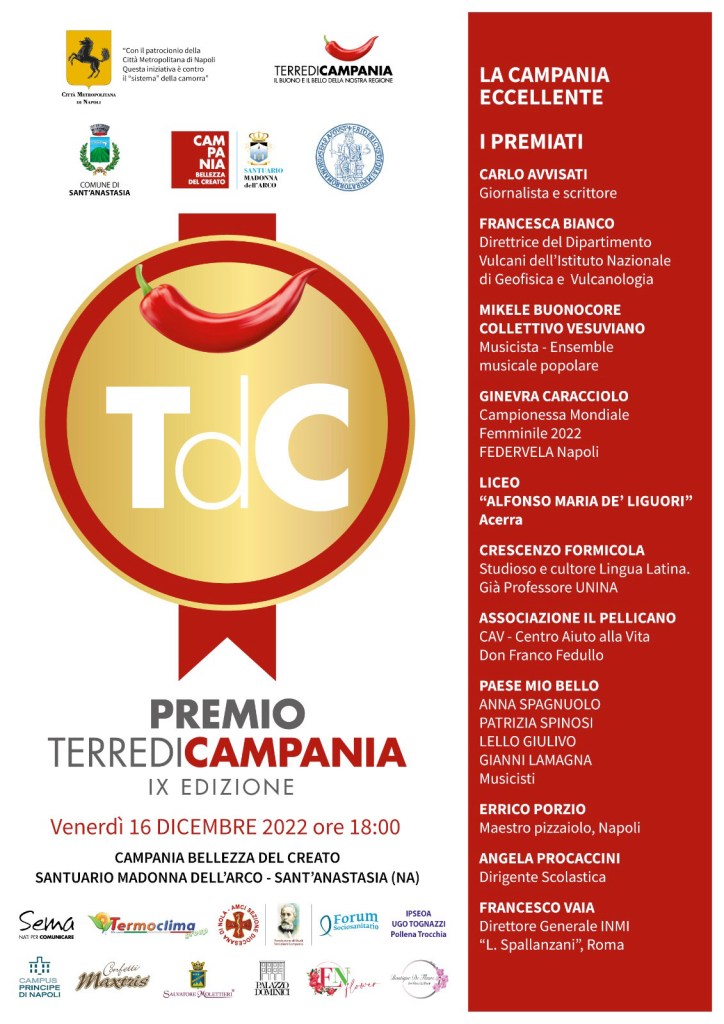 Un riconoscimento che vive da nove anni, una relazione, perché ci si riconosce, appunto, uno nel lavoro dell’altro, uno nell’impegno dell’altro, uno nei valori dell’altro; da quest’anno il Premisi avvale della fattiva collaborazione con la Comunità dei Domenicani del Santuario della Madonna dell’Arco, unitamente al Priore Padre Gianpaolo Pagano. L’edizione 2022 del Premio Terre di Campania vede i riconoscimenti assegnati a: Carlo Avvisati, Giornalista e scrittore, cultore della lingua napoletana; Francesca Bianco, Direttrice del Dipartimento Vulcani dell’Istituto Nazionale di Geofisica e Vulcanologia; Mikele Buonocore e il Collettivo Vesuviano, Musicista/ Ensemble musicale popolare; Ginevra Caracciolo, Campionessa Mondiale 2022 FEDERVELA Napoli; Crescenzo Formicola, già Docente di Letteratura Latina UNINA, scrittore e cultore della lingua latina; Associazione Il Pellicano, CAV – Centro Aiuto alla Vita; Paese mio Bello (Anna Spagnuolo, Patrizia Spinosi, Lello Giulivo, Gianni Lamagna), Musicisti; Errico Porzio, Maestro pizzaiolo; Angela Procaccini, Dirigente Scolastica; Francesco Vaia, Direttore Generale INMI “l. Spallanzani”, Roma. Sarà inoltre premiato, in rappresentanza di tutte le scuole secondarie di Secondo Grado in Campania, il Liceo “Alfonso Maria de’ Liguori” di Acerra, che nel periodo della pandemia da Sars_Covid 19 ha saputo mettere in pratica la lezione di P.P. Pasolini, il quale ha sempre difeso, nei suoi scritti, la libertà di sapere e di fare sapere: con lodevole resilienza, le attuali quinte liceo sono state preparate a sostenere serenamente l’Esame di Stato. Tutti i Premiati riceveranno un’opera dell’artista archeo realista Evan De Vilde. La cerimonia di Premiazione sarà allietata da intermezzi musicali. Seguirà un rinfresco e brindisi finale.
